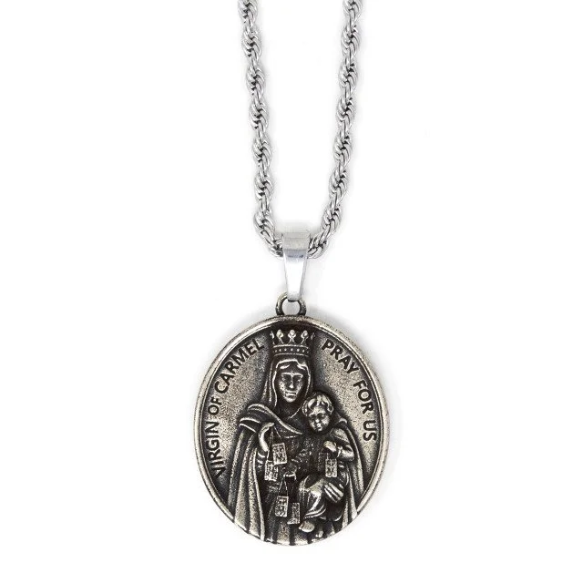 In 1910, Pope St. Pius X introduced a scapular medal which may be substituted in most cases for any of the various scapulars. In Via uses a variety of premium metals in making robust rosaries and pendants. This scapular medal, made of solid white bronze, rests on a 22 in. steel rope chain.
