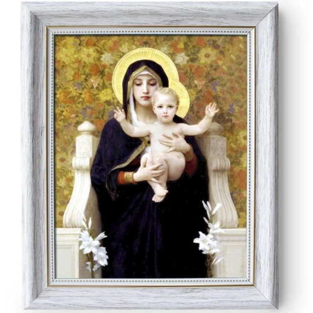 The Madonna of the Lilies by realist William-Adolphe Bouguereau depicts our beloved Queen seated on her throne, encircled by lilies symbolizing purity. She holds the Divine Child tightly to her chest, demonstrating the loving support she offers to all her children. For a limited time, you can save 10% on this framed artwork!